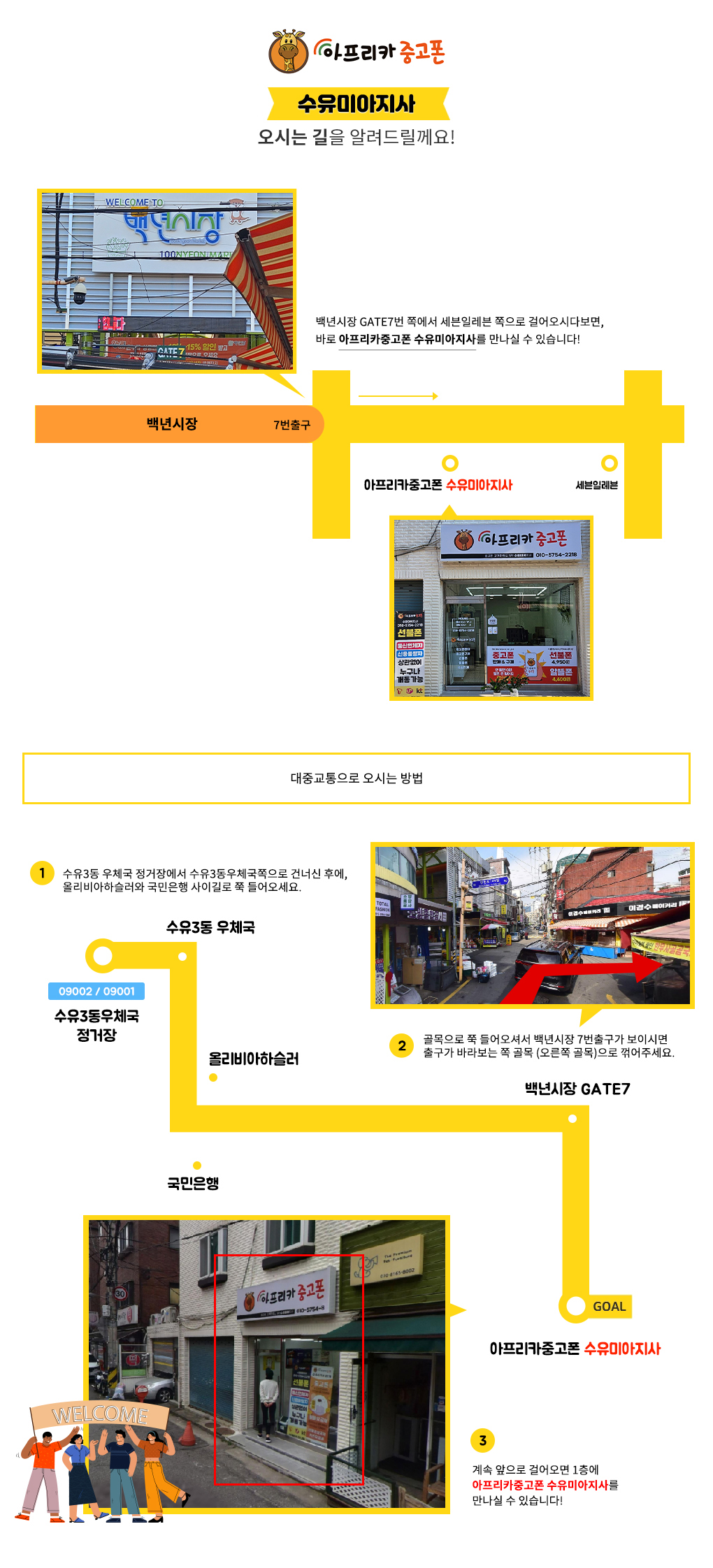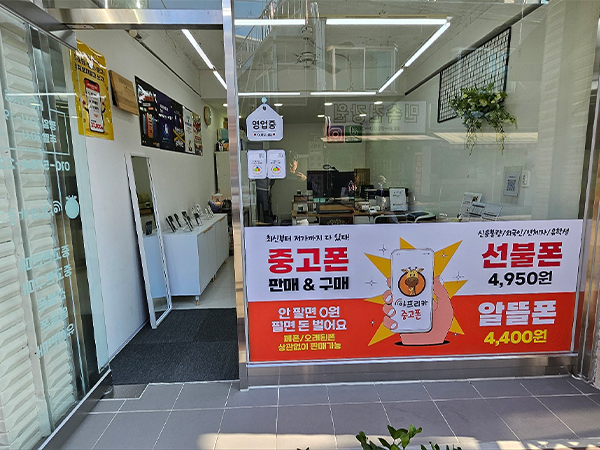 - 수유백년시장 7번출입구에서 수유손칼국수 사이로 들어오시면 1층에 아프리카중고폰을 보실 수 있습니다.